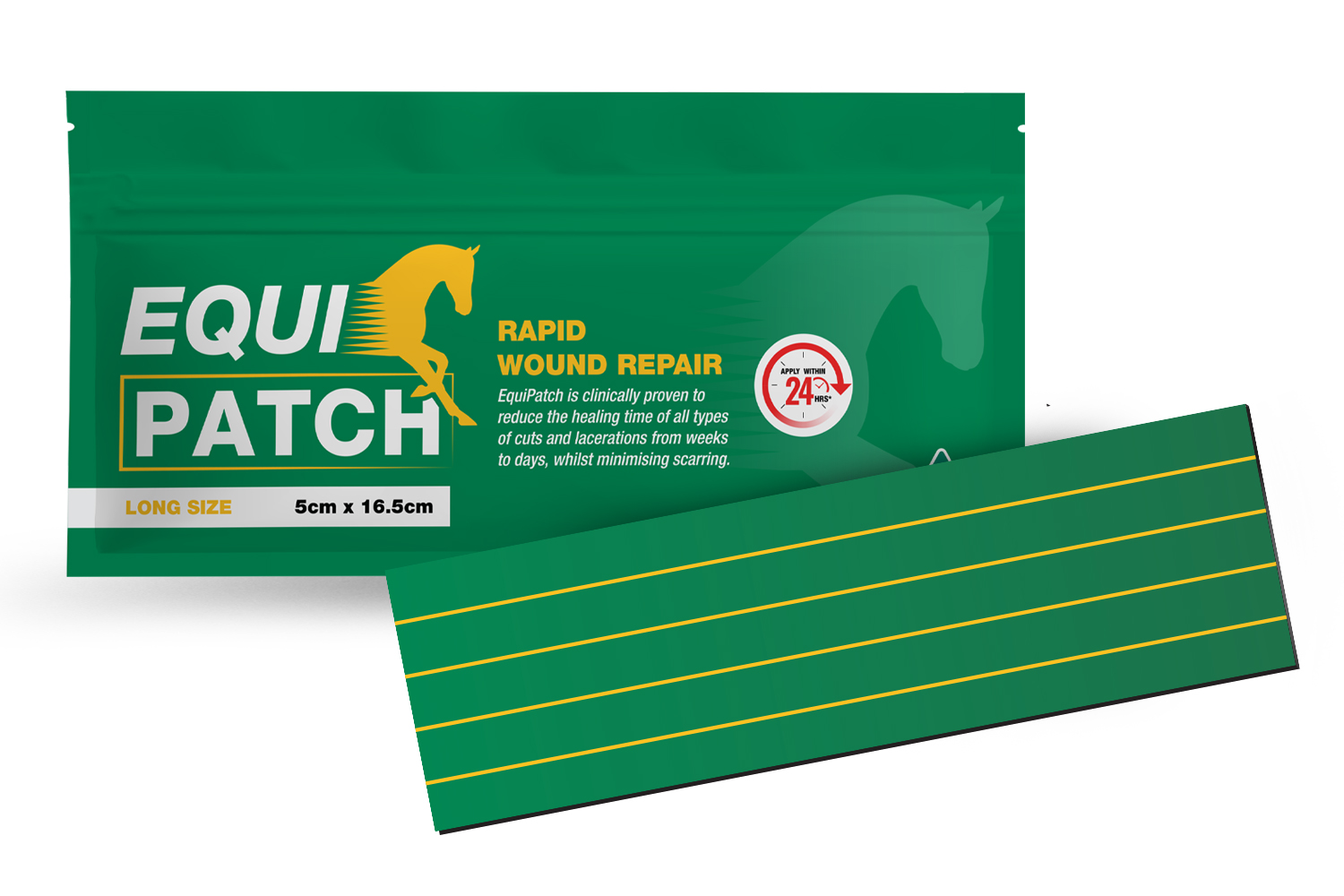 EquiPatch is a reusable silicone dressing clinically proven to reduce the healing time of all types of horse wounds, such as cuts and lacerations, from weeks to days, minimising scarring and proud flesh.