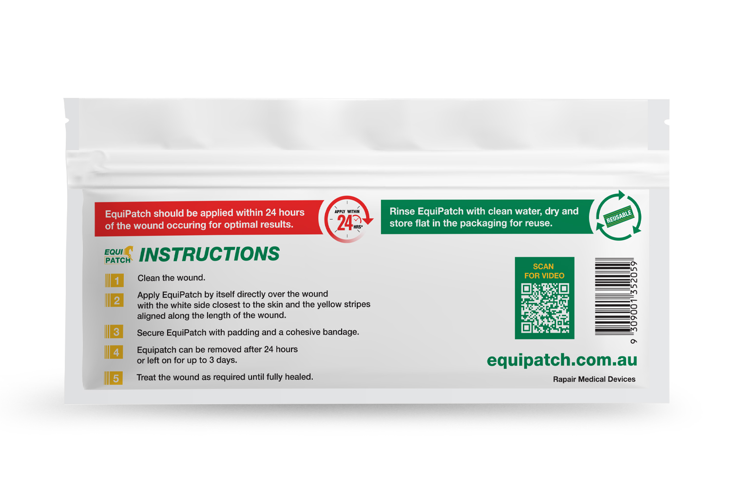 Cleaning: Rinse EquiPatch with clean water, dry and store flat in the packaging for reuse.